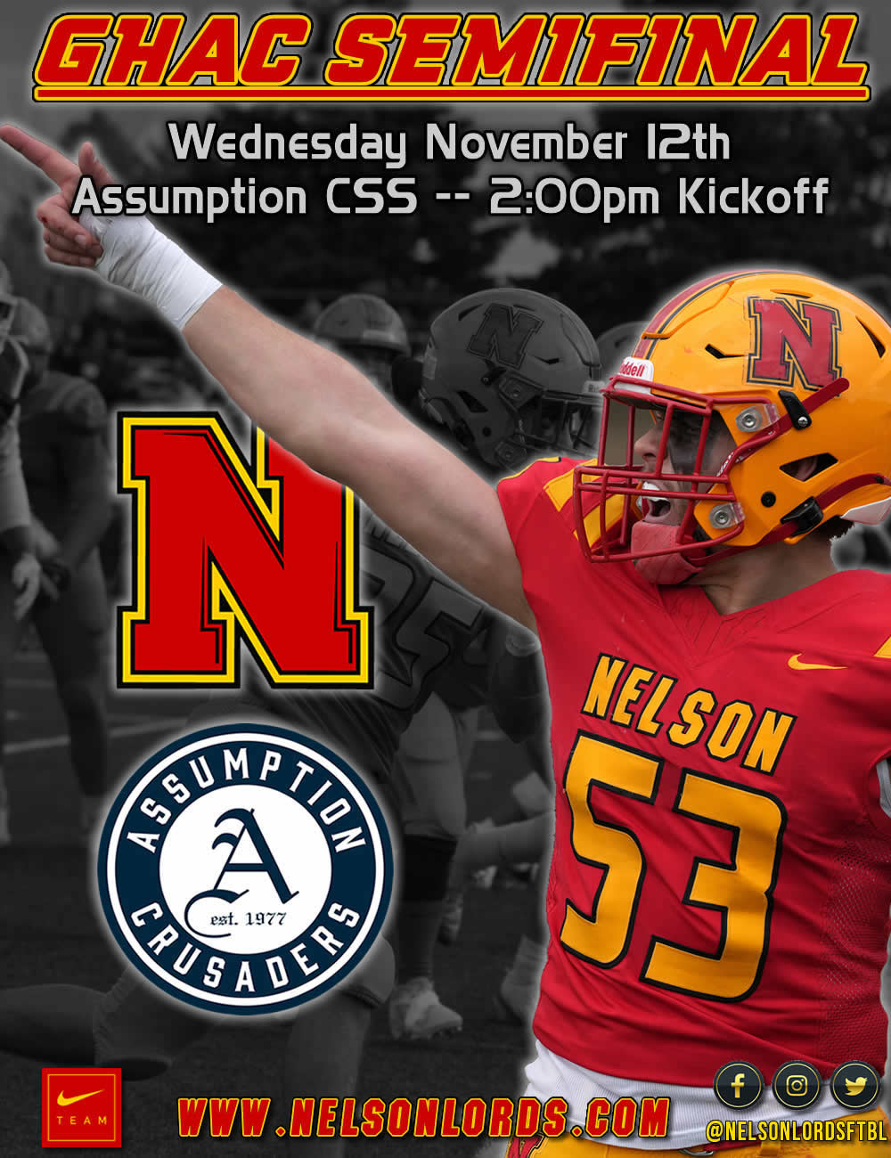 The Lords will make the short trip to Assumption on Wednesday to rekindle one of the Province's best rivalries in the 2025 GHAC Semifinal. The two teams have not met in a decade since the Halton leagues separated. The Crusaders have been at the top of the HCAA for the past few seasons, finally breaking through this year to defeat Corpus Christi 17-10 to advance last Friday. The Lords enter the game riding high after their 27th league title in school history. The Battle of Burlington never disappoints and expect to see a large Nelson crowd in attendance for this one!