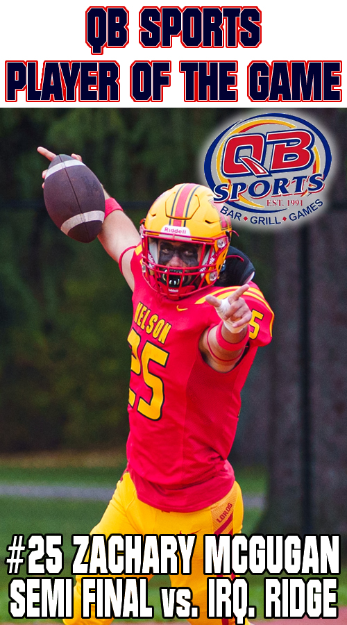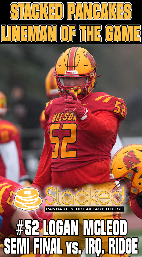 McLeod was dominant in the run game opening up holes for the Lords to rack up 5 rushing TDs in poor weather. A key fumble recovery on defence also helped propel Nelson to a big win and send them back to the HSSAA Championship game. |